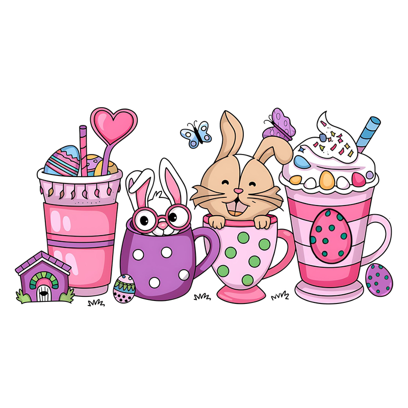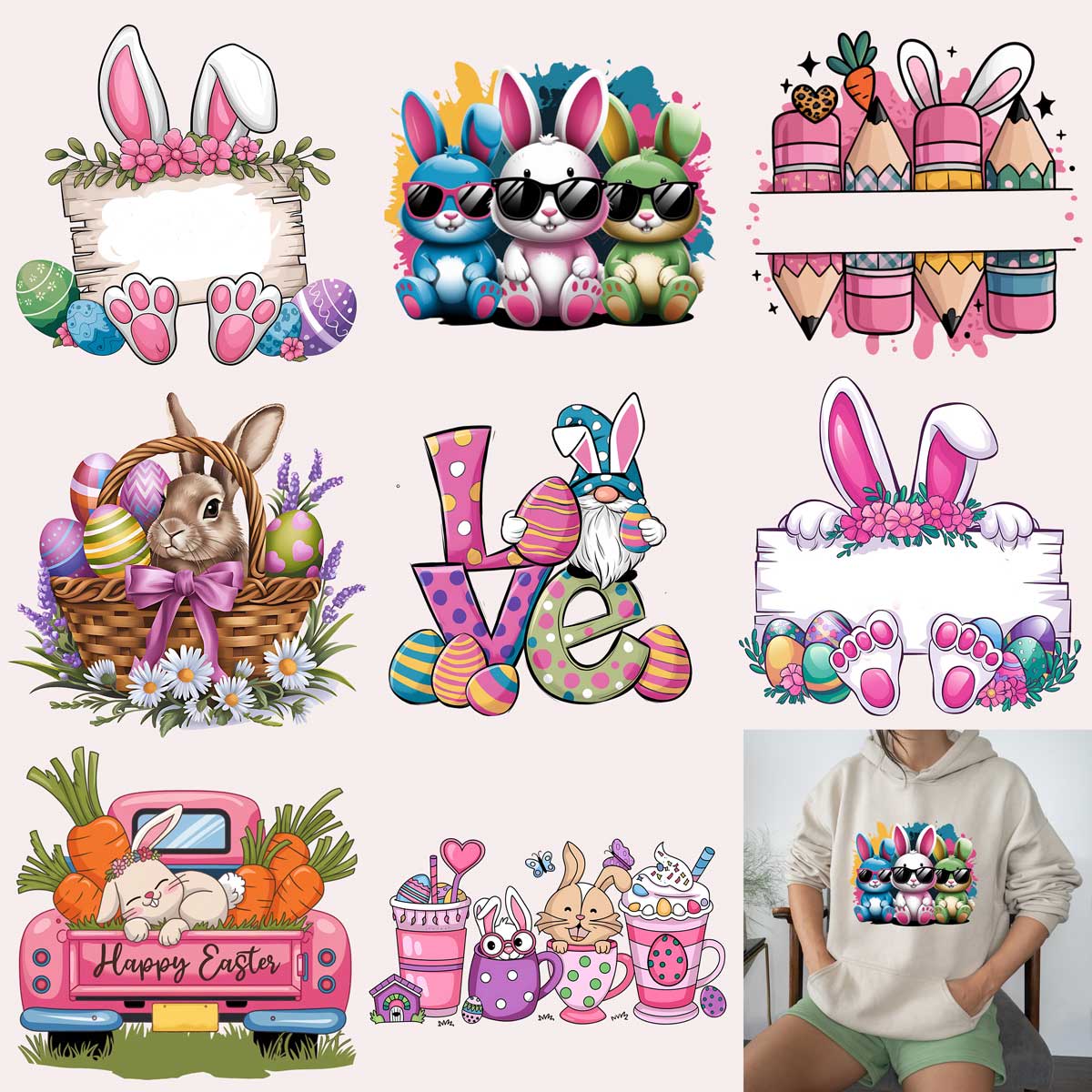 Adorable Easter-themed featuring bunnies, eggs, flowers, and festive designs in bright and playful pastel colors. DTF ready to press