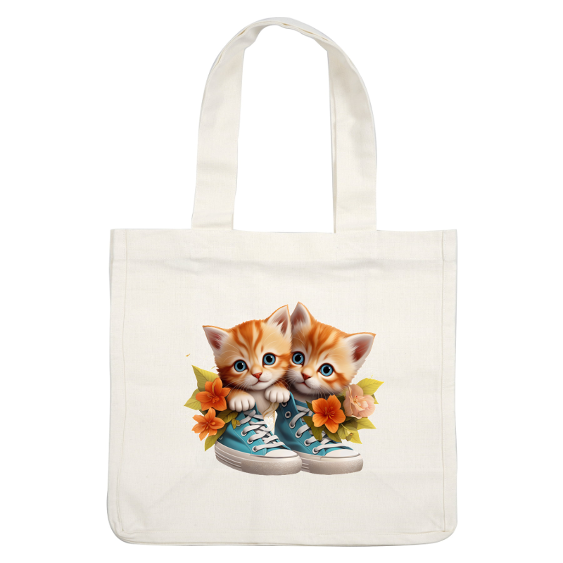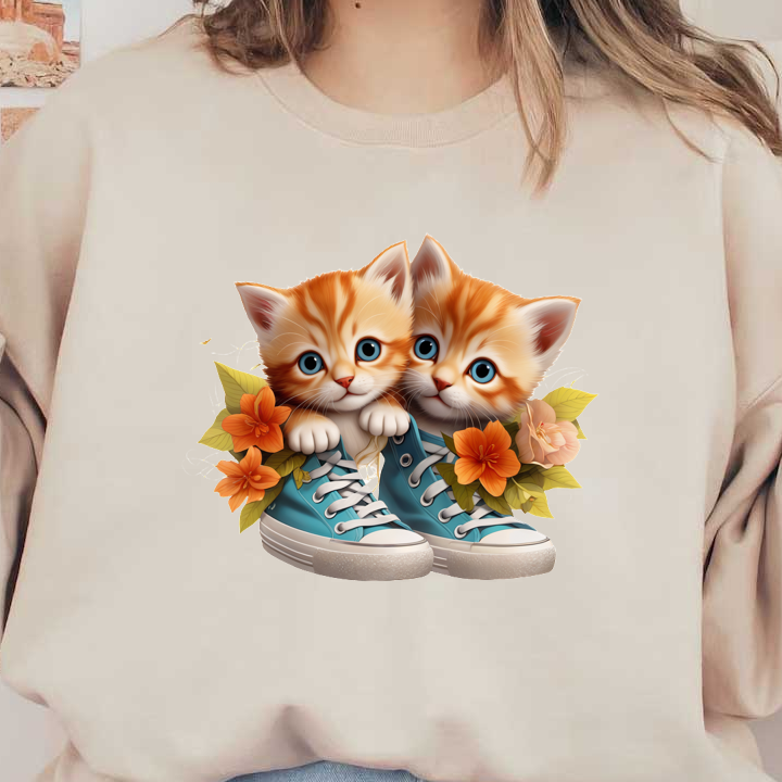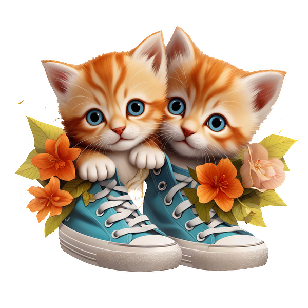 Adorable twin kittens in turquoise sneakers, surrounded by colorful flowers, bring a whimsical charm to any setting! dtf prints