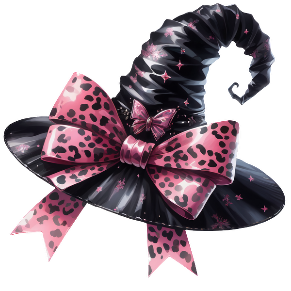 Adorned with a stylish pink and black leopard-print bow, this whimsical witch's hat features an elegant twist and sparkling details.dtf regular iron