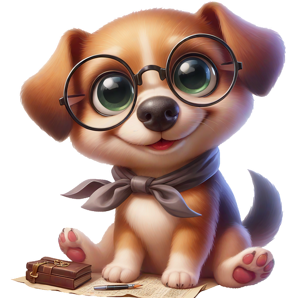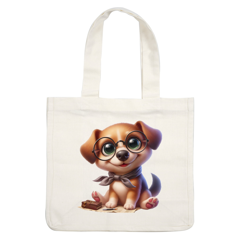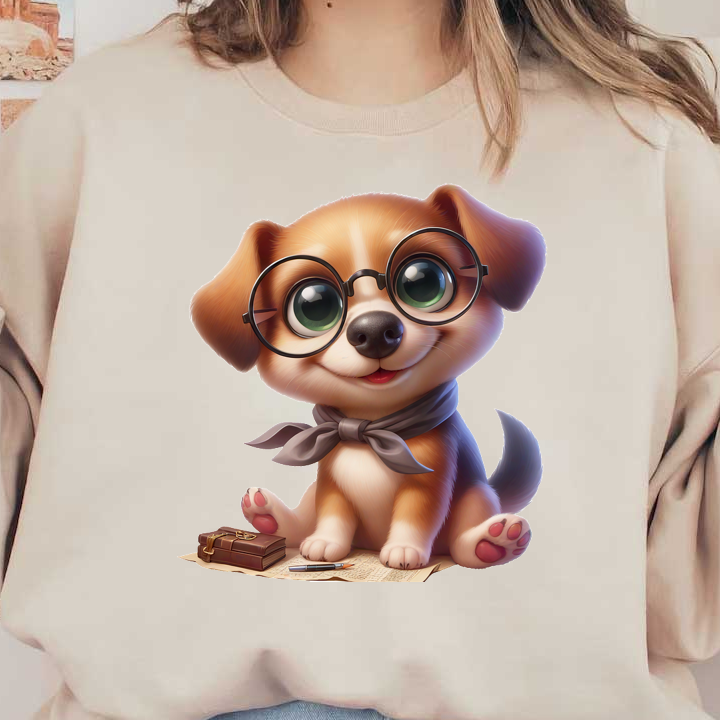 An adorable, cartoon-style puppy wearing oversized glasses and a scarf, sitting playfully with a notebook and pencil. dtf prints