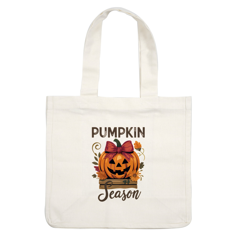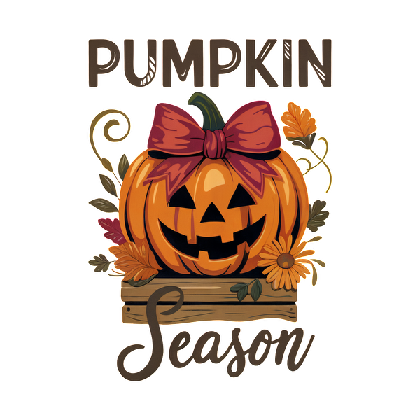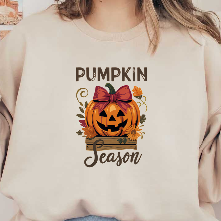 Bright and cheerful illustration featuring a smiling pumpkin with a bow, celebrating the festive "Pumpkin Season" surrounded by autumn flowers. dtf prints