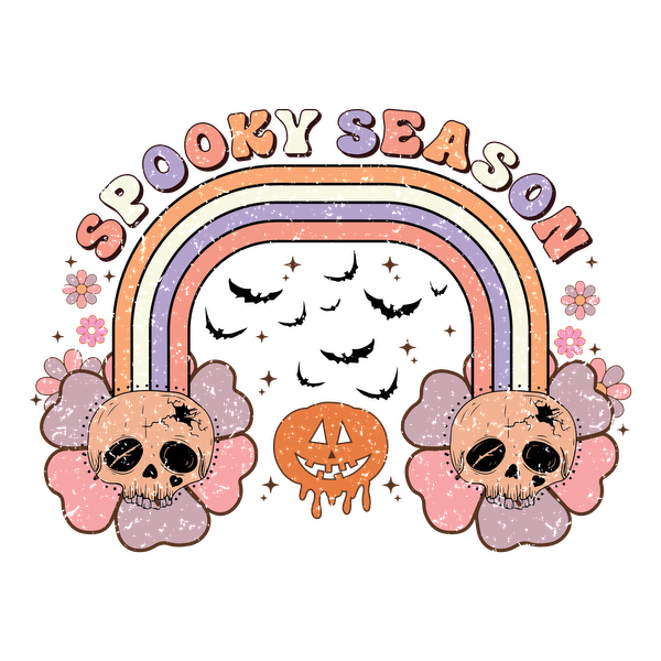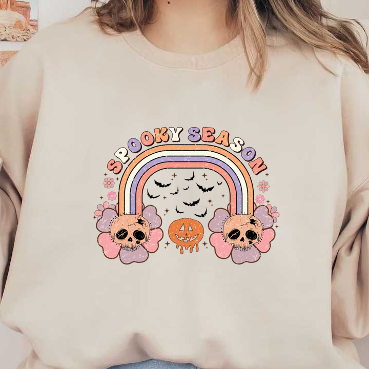 Celebrate Halloween with this playful design featuring skulls, a pumpkin, and a colorful rainbow labeled "Spooky Season." dtf transfers