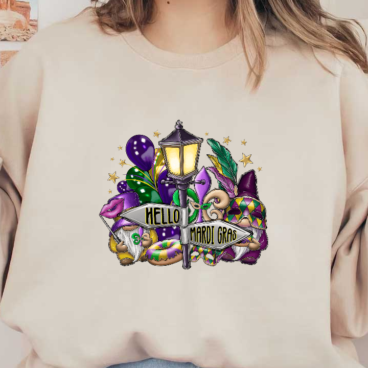 Celebrate Mardi Gras with this festive illustration featuring whimsical gnomes, vibrant beads, and a cheerful street sign adorned with colorful accents!DTF Transfers
