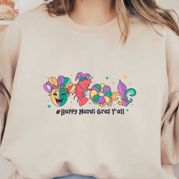 Celebrate Mardi Gras with vibrant artwork featuring a jester mask, colorful beads, a festive wreath, and a fleur-de-lis!DTF Transfers