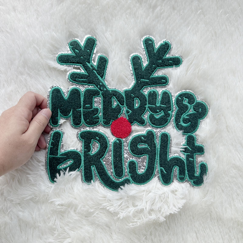 Celebrate the season with this vibrant "Merry & Bright" holiday sign featuring festive antlers and a cheerful red bauble!Patches