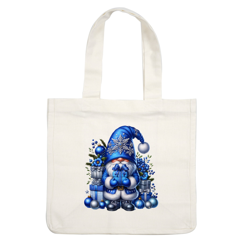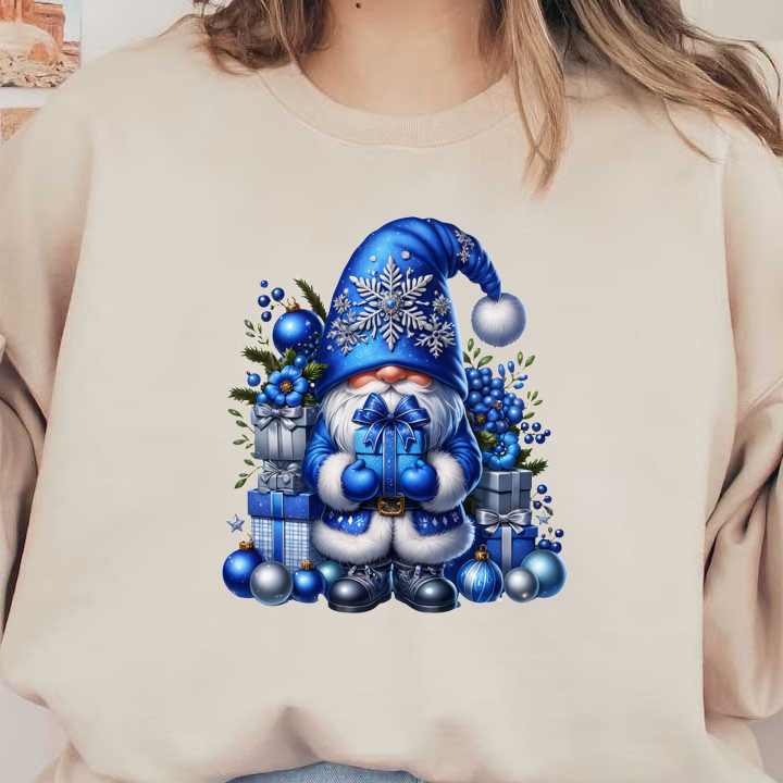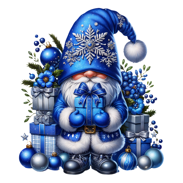 Cheerful blue Santa gnome wearing a snowflake hat holds a gift among festive decorations and presents in blue hues.DTF Transfers heat press transfers