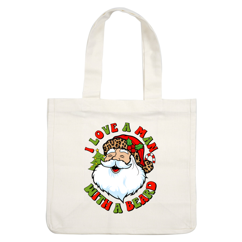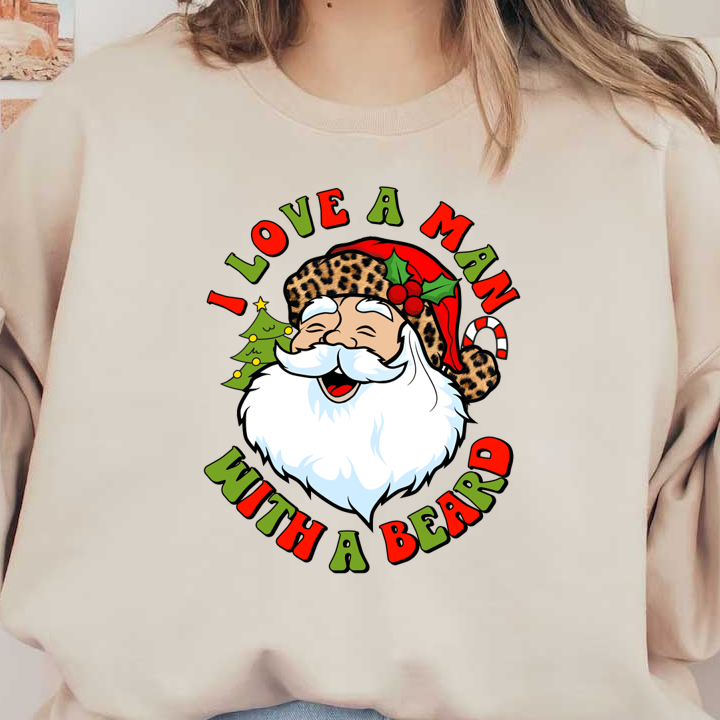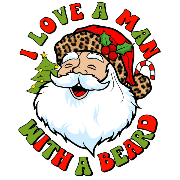 Cheerful holiday-themed graphic featuring a smiling Santa with a leopard-print hat, proclaiming "I love a man with a beard."dtf regular iron