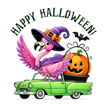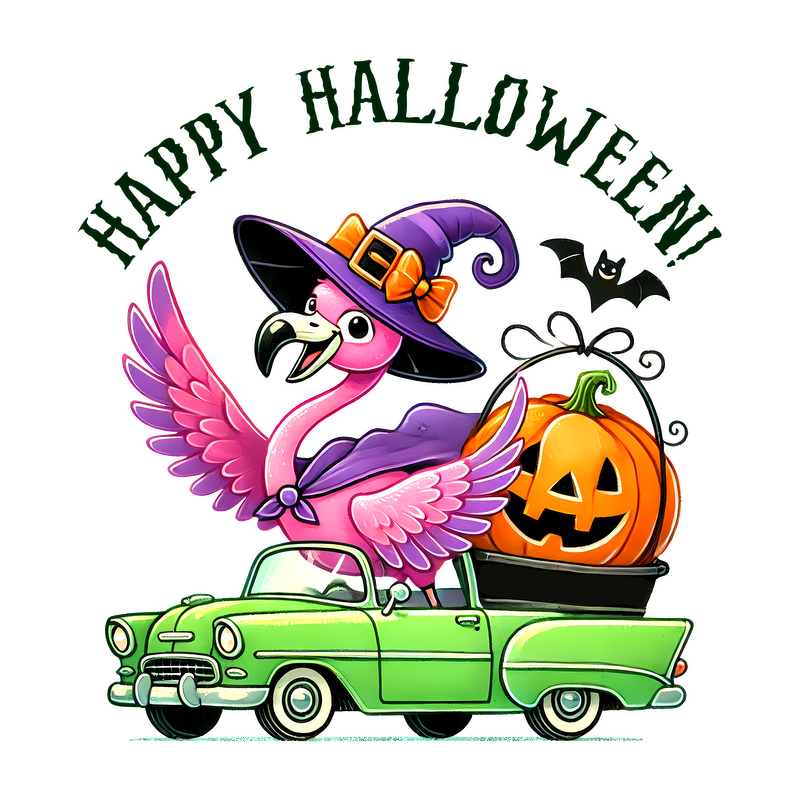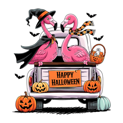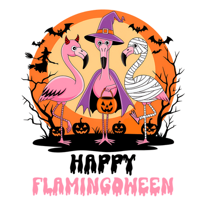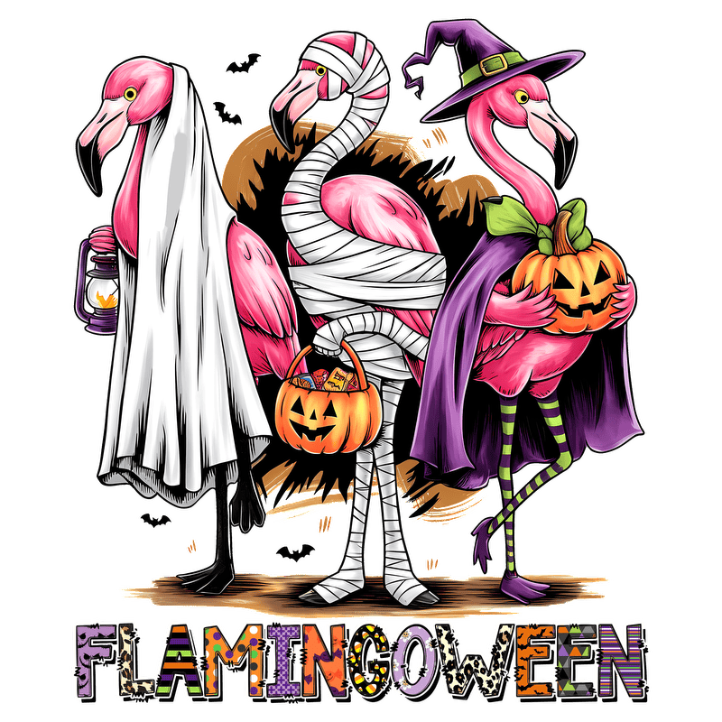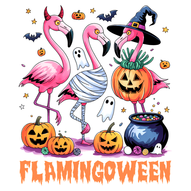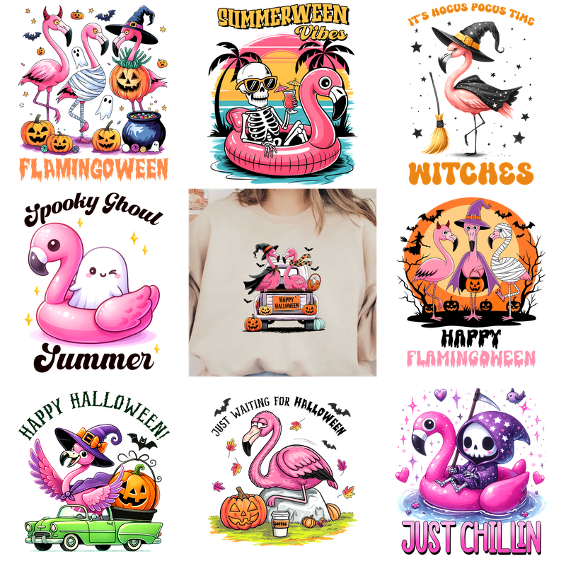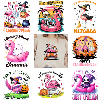 Colorful Halloween-themed flamingo graphics featuring festive pumpkins and summer vibes.DTF Transfers