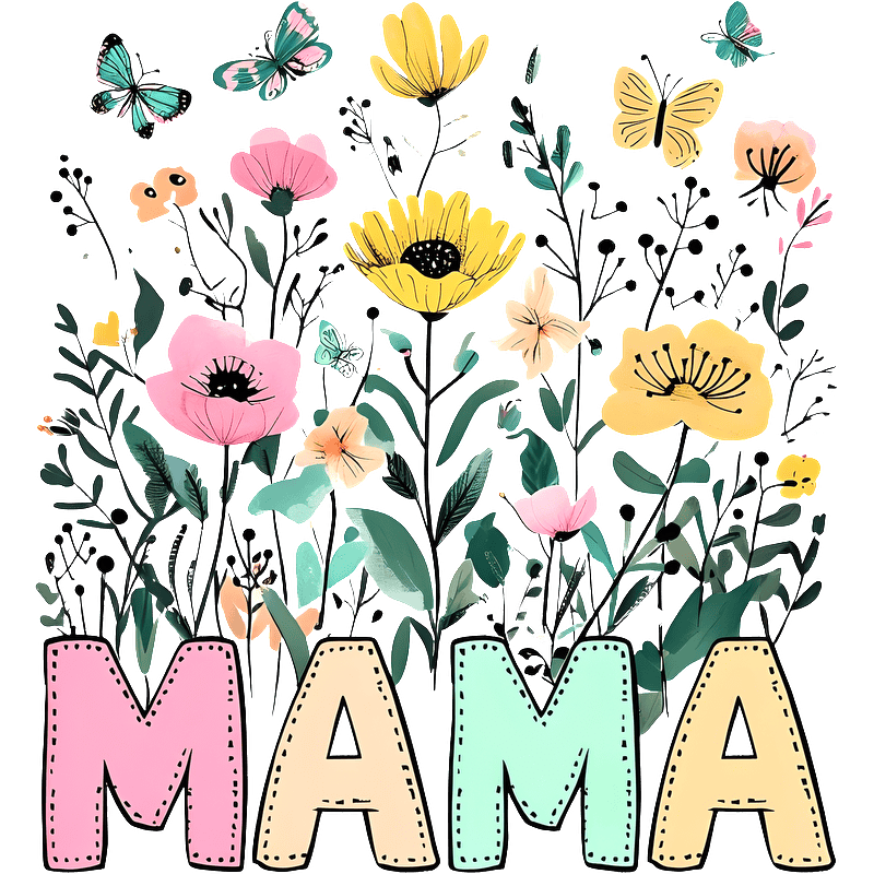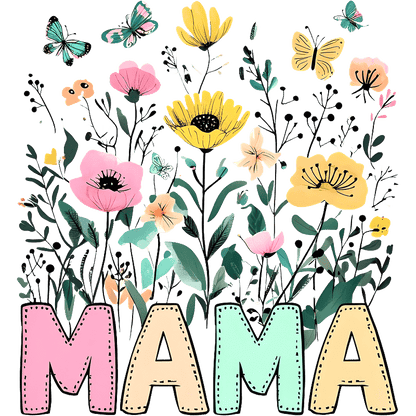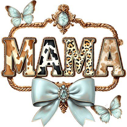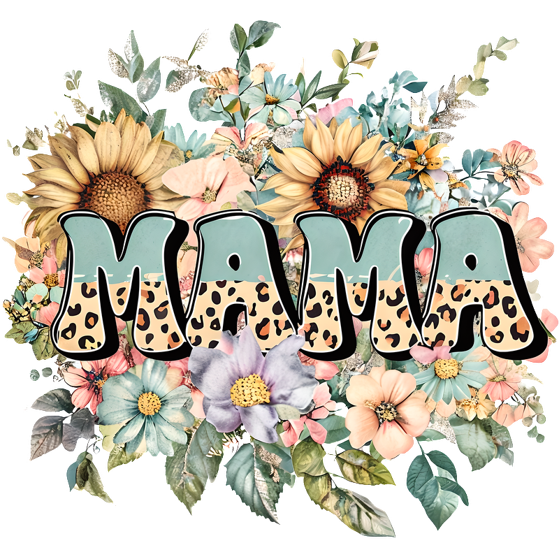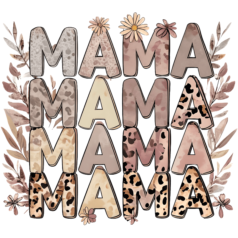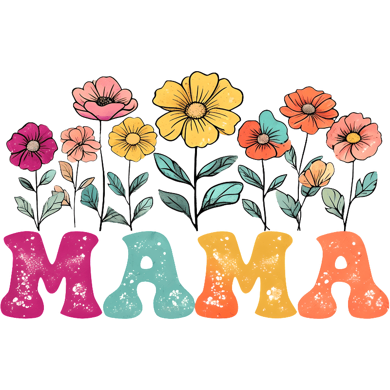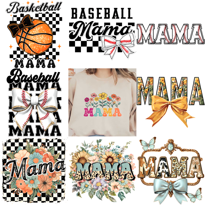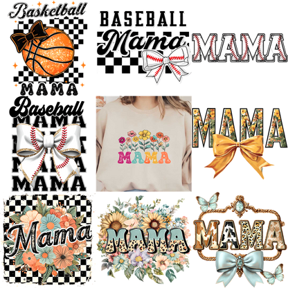 Colorful "Mama" designs featuring sports, flowers, and playful bows in different styles.DTF Transfers