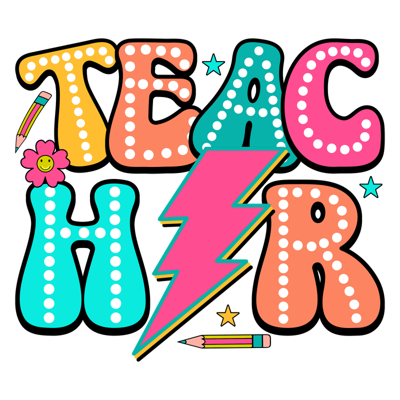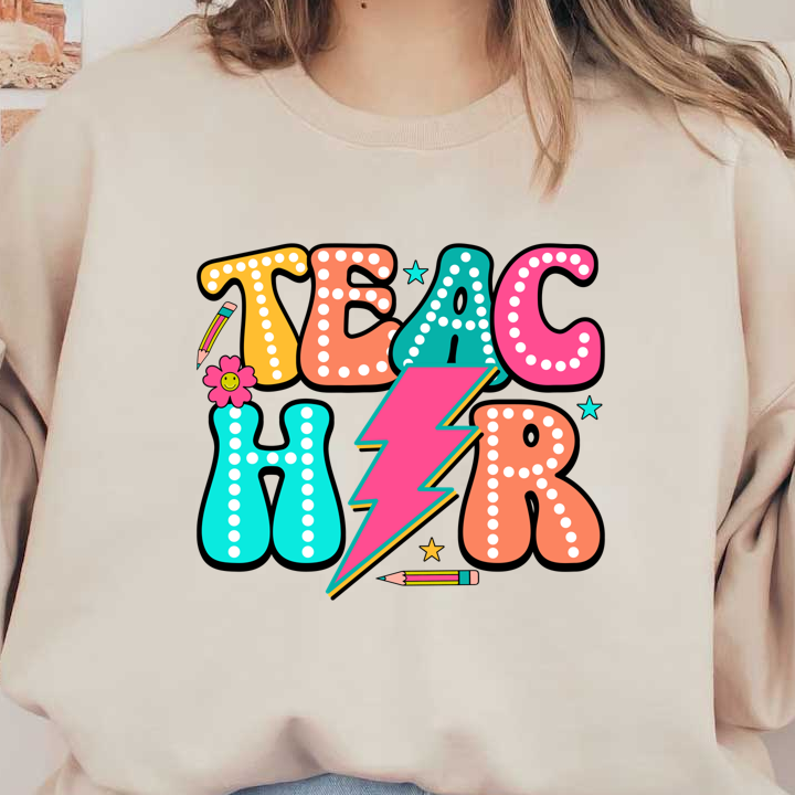 Colorful, playful design featuring the word "TEACHER" with polka dots, a lightning bolt, and cheerful graphics like a flower and pencil.DTF Transfers