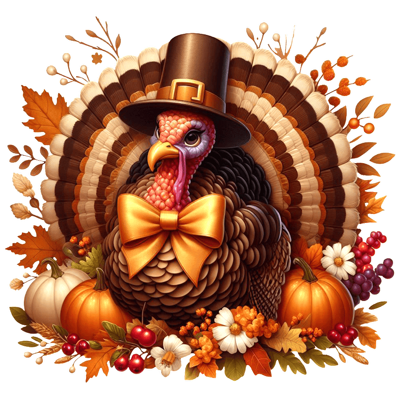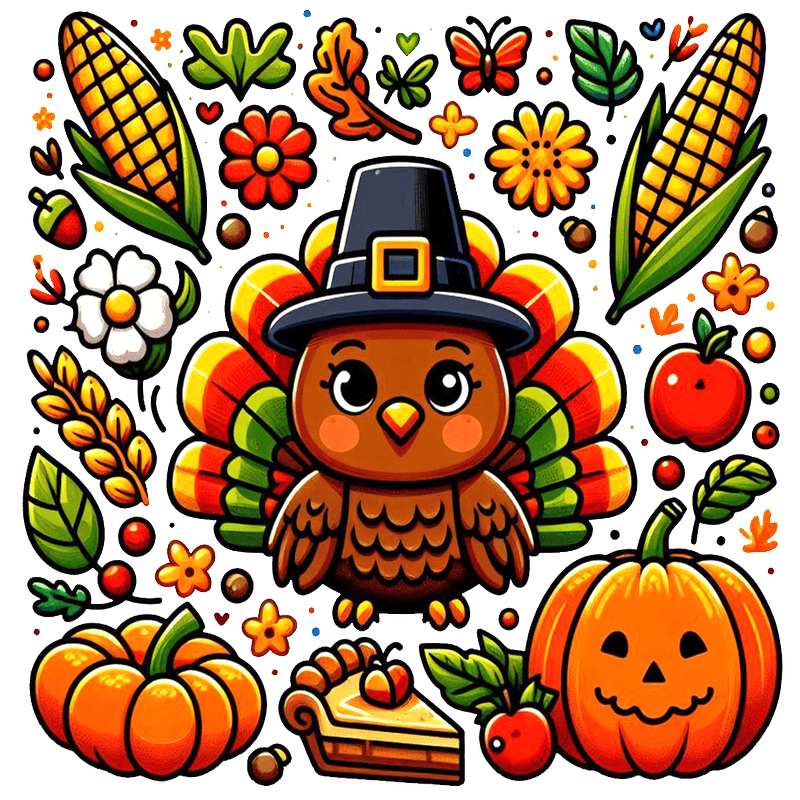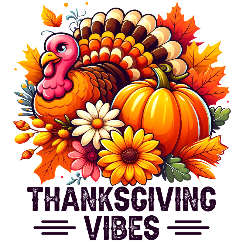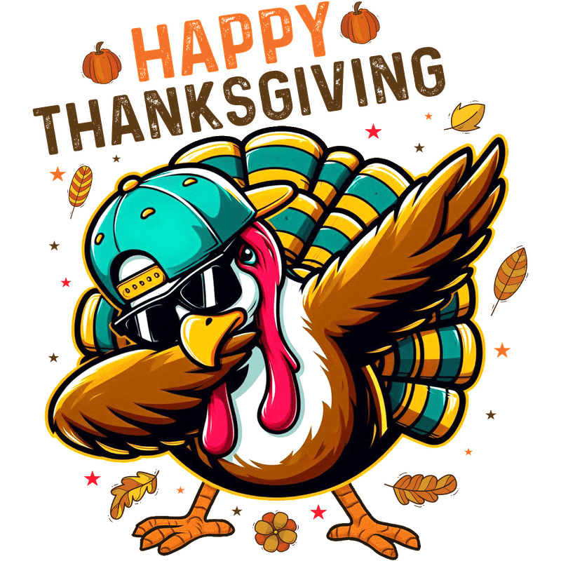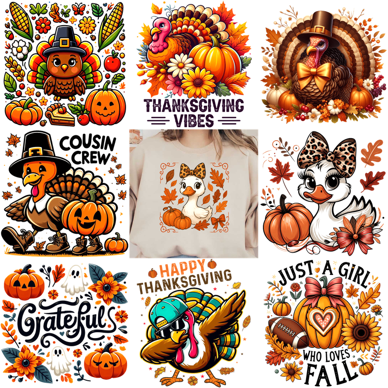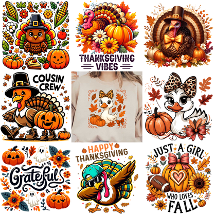 Colorful Thanksgiving-themed designs featuring turkeys, pumpkins, and festive expressions.DTF Transfers