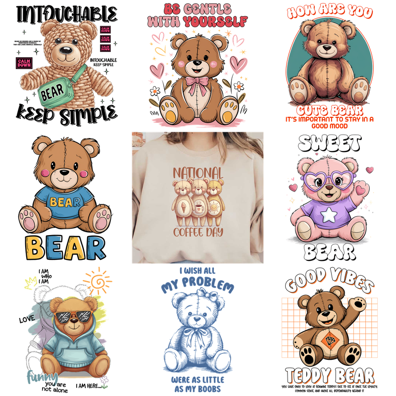 Cute teddy bear-themed graphics for National Coffee Day apparel.DTF Transfers
