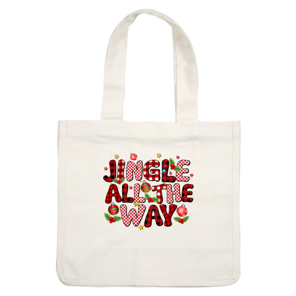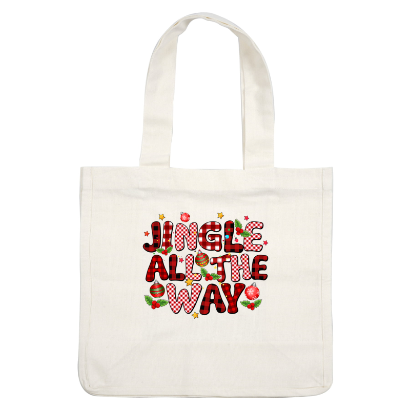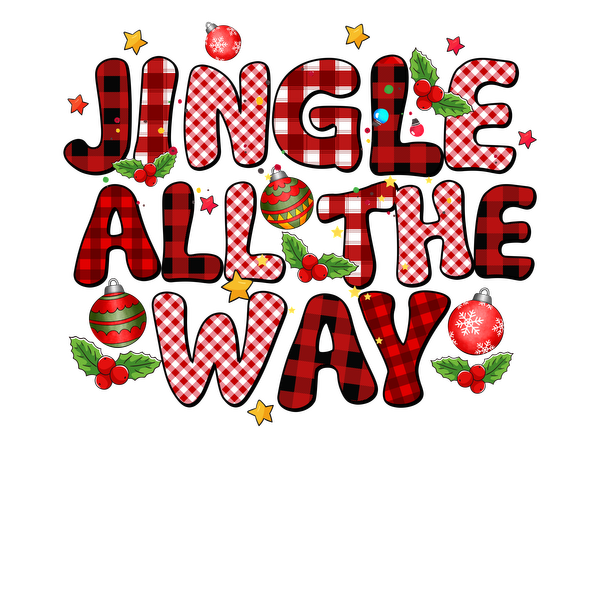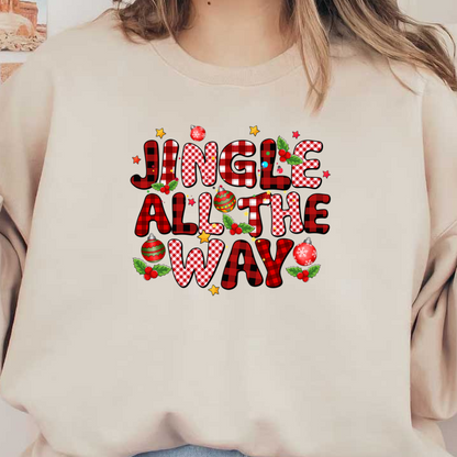 Festive "Jingle All the Way" design featuring playful plaid letters, ornaments, and holly, perfect for the holiday season! dtf prints