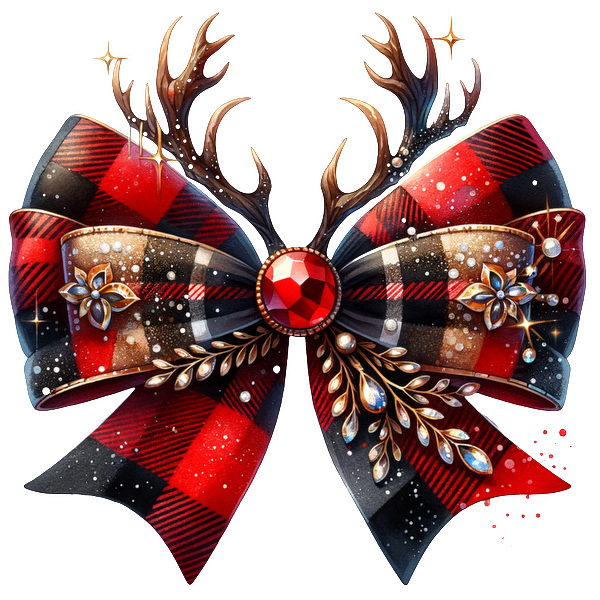 Festive red and black plaid bow adorned with jewels and antlers, perfect for holiday decorations or gift wrapping. dtf prints