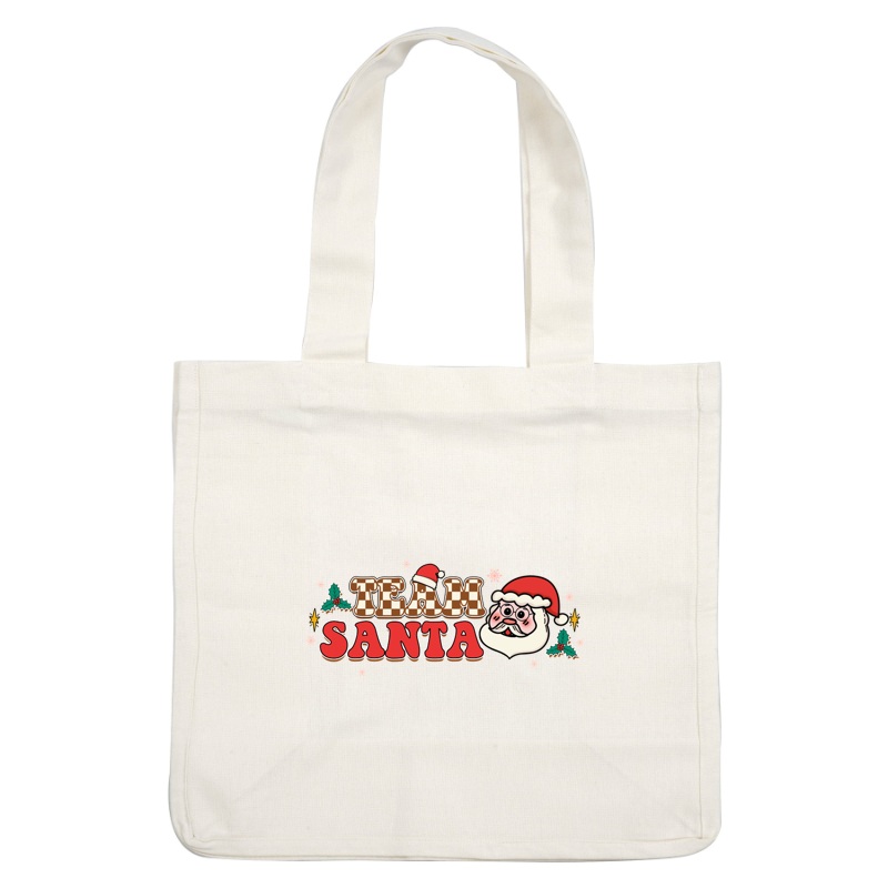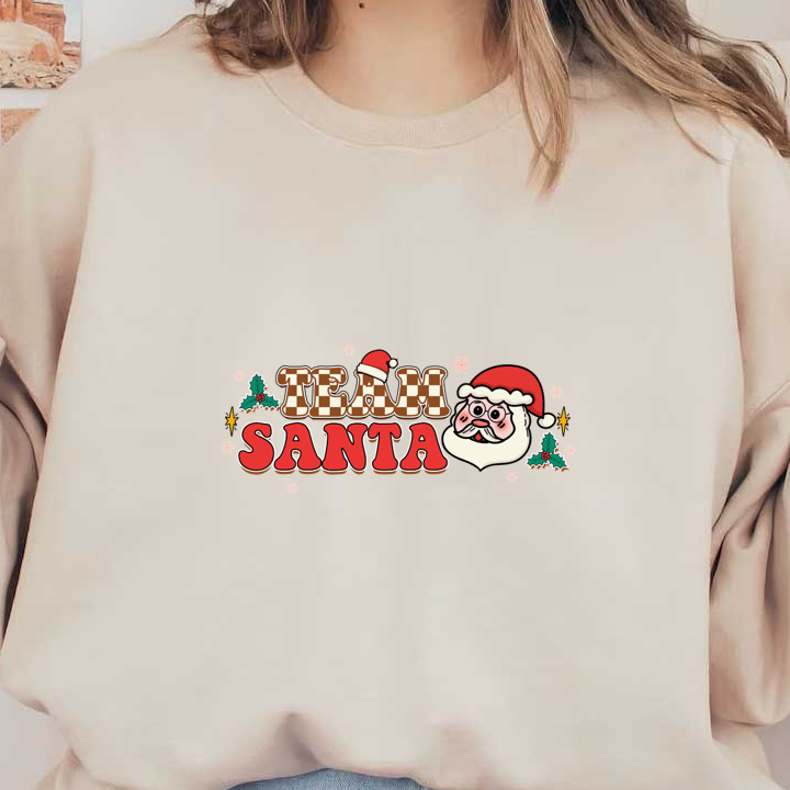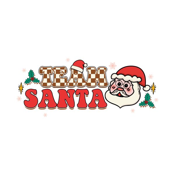 Festive "Team Santa" graphic featuring a jolly Santa and cheerful holiday elements, perfect for Christmas spirit! heat press transfers