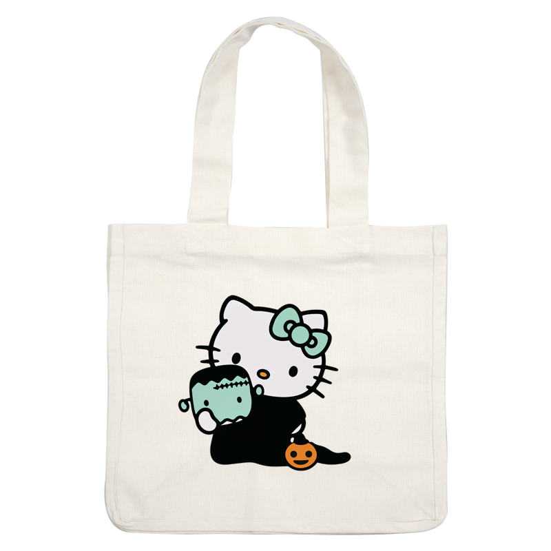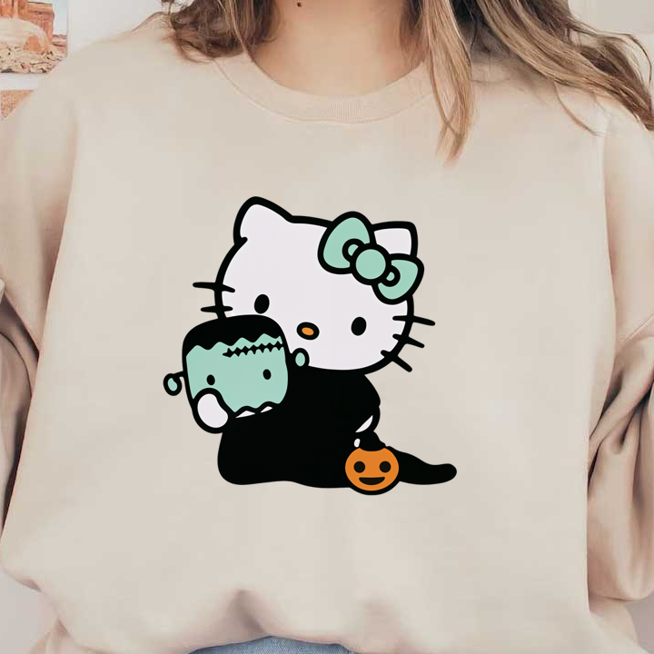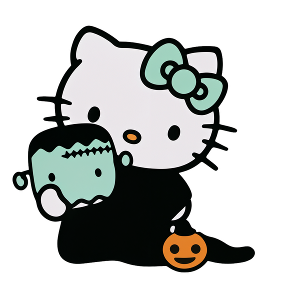 Hello Kitty cuddles a cute Frankenstein in a Halloween-themed design, featuring playful colors and festive elements.DTF Transfersdtf regular iron