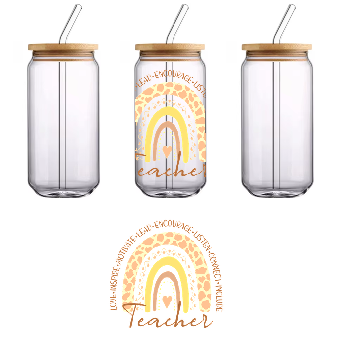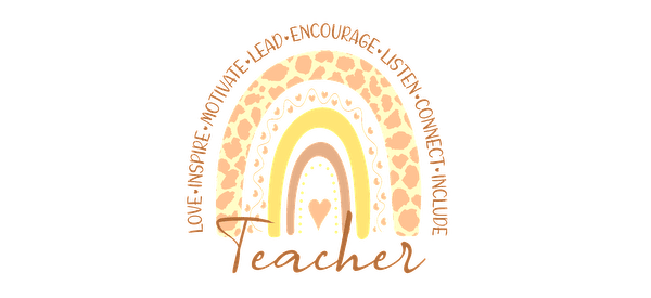 Multicolored rainbow graphic tee featuring the word "Teacher".UV Transfers