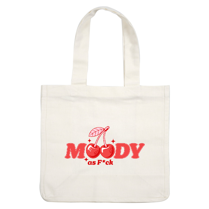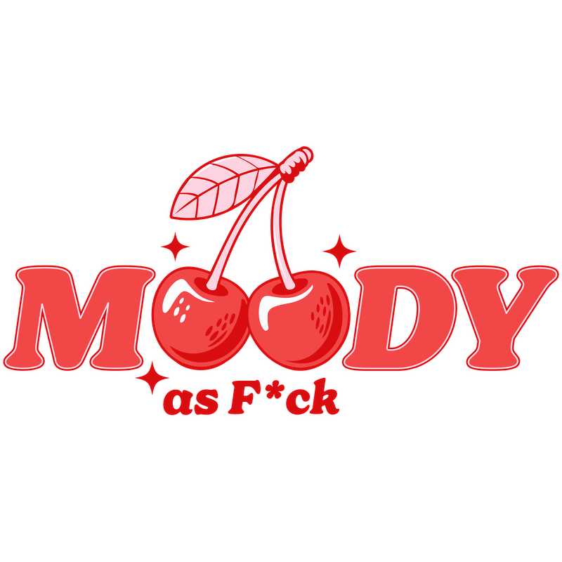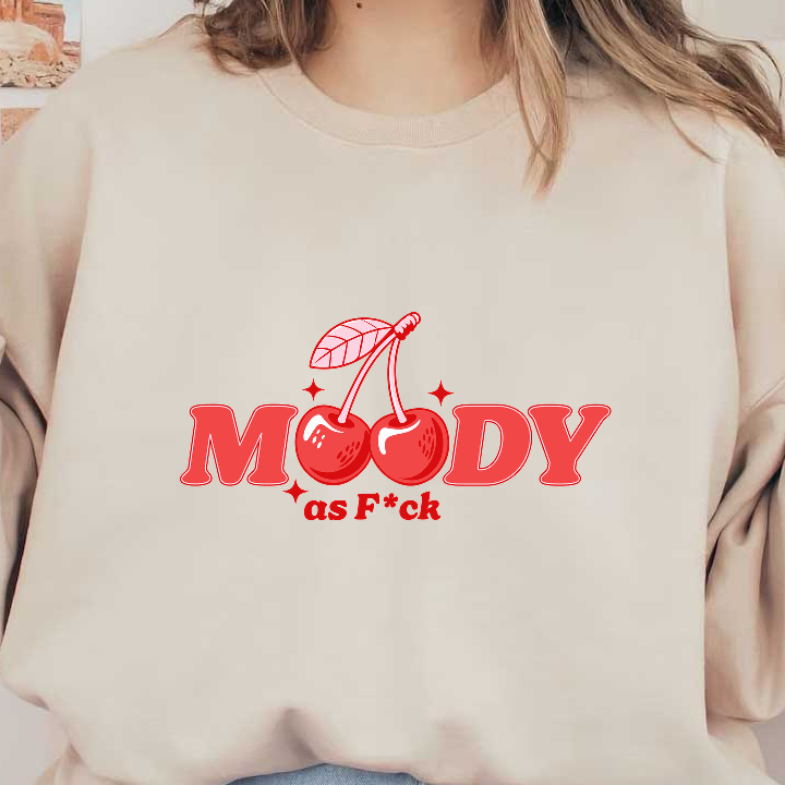 Red shirt with cherry design spelling out "Moody as F."DTF Transfers