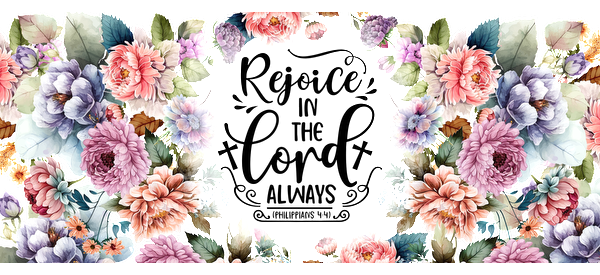 religious wall art featuring watercolor flowers and the text "This is a religious wall art featuring watercolor flowers and the text 'Rejoice in the Lord always.'".UV Transfers