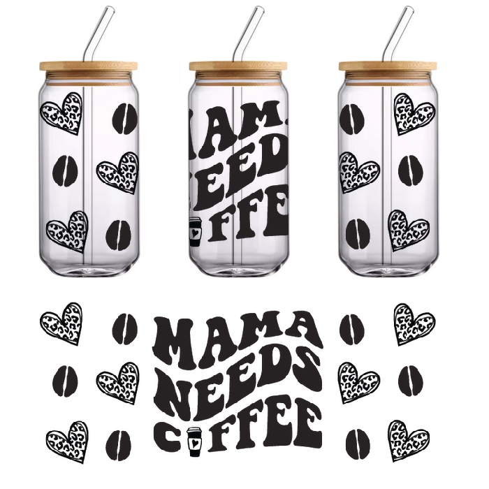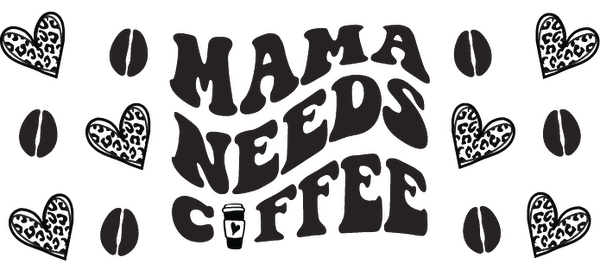 Temporary tattoo with mama needs coffee slogan and heart and coffee beans design.UV Transfers