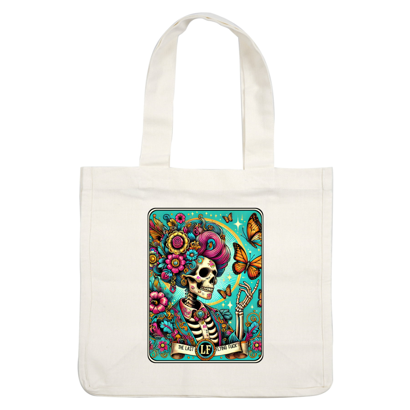 This vibrant art print features a colorful skeleton adorned with flowers and butterflies, showcasing a playful and whimsical design.