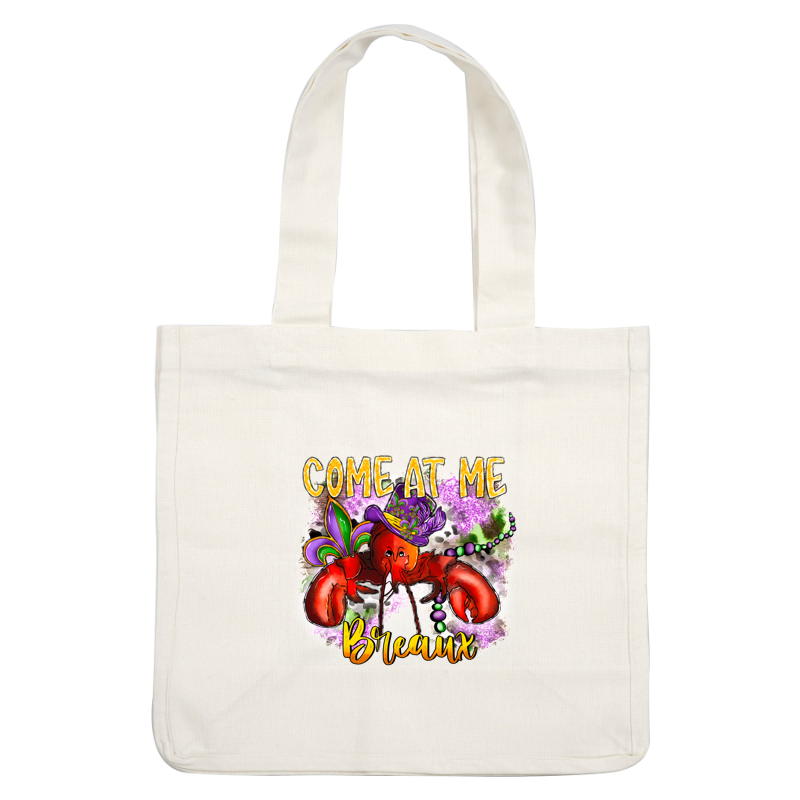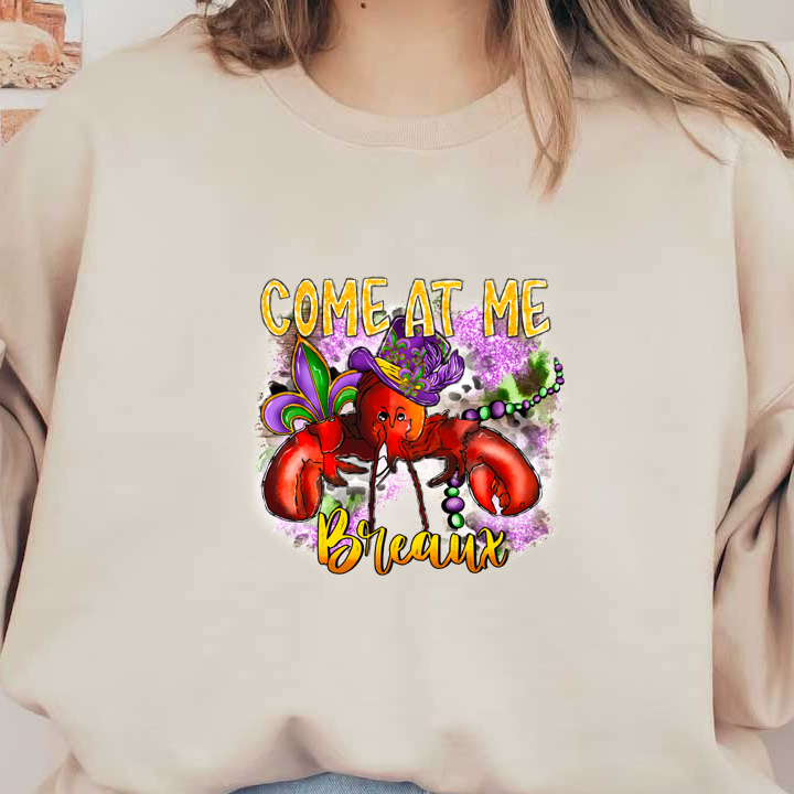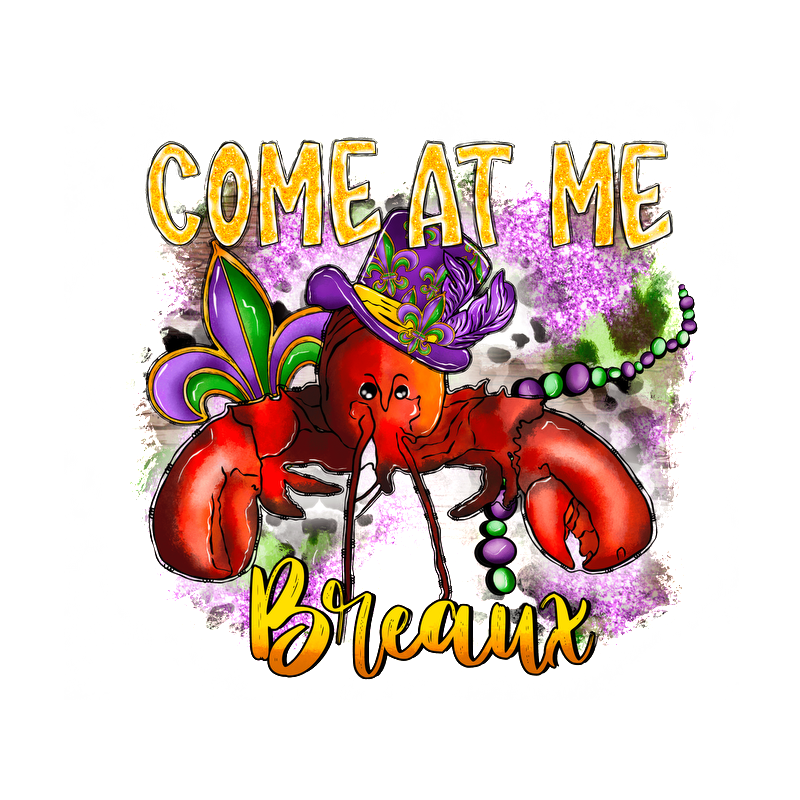 This vibrant graphic features a festive lobster wearing a colorful Mardi Gras hat, accompanied by decorative beads and playful text.DTF Transfers