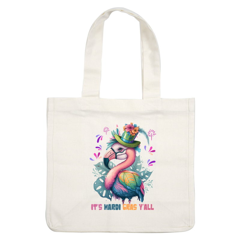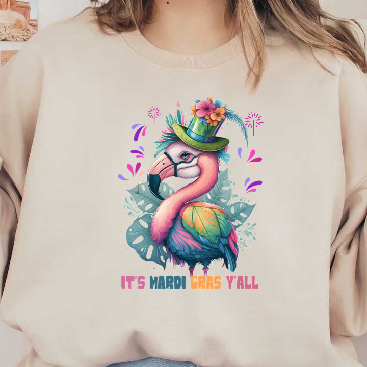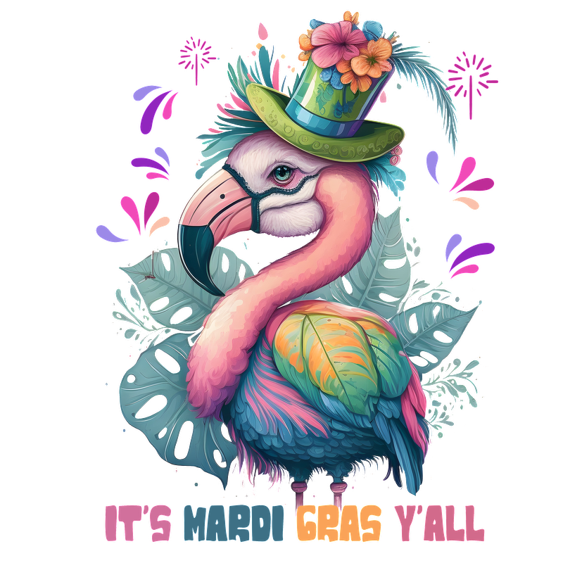 This vibrant Mardi Gras-themed design features a colorful flamingo wearing a festive hat, surrounded by tropical leaves and playful text.DTF Transfers