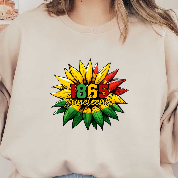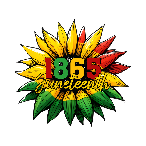Vibrant Juneteenth design featuring a flower motif, with bold colors and the year "1865" prominently displayed.
