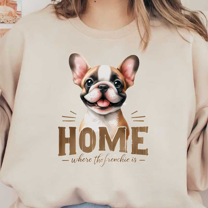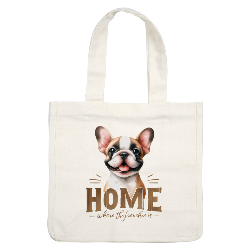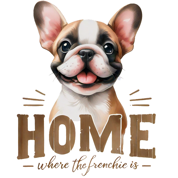 Whimsical illustration featuring a cheerful French Bulldog with the phrase "Home where the Frenchie is," perfect for pet lovers.